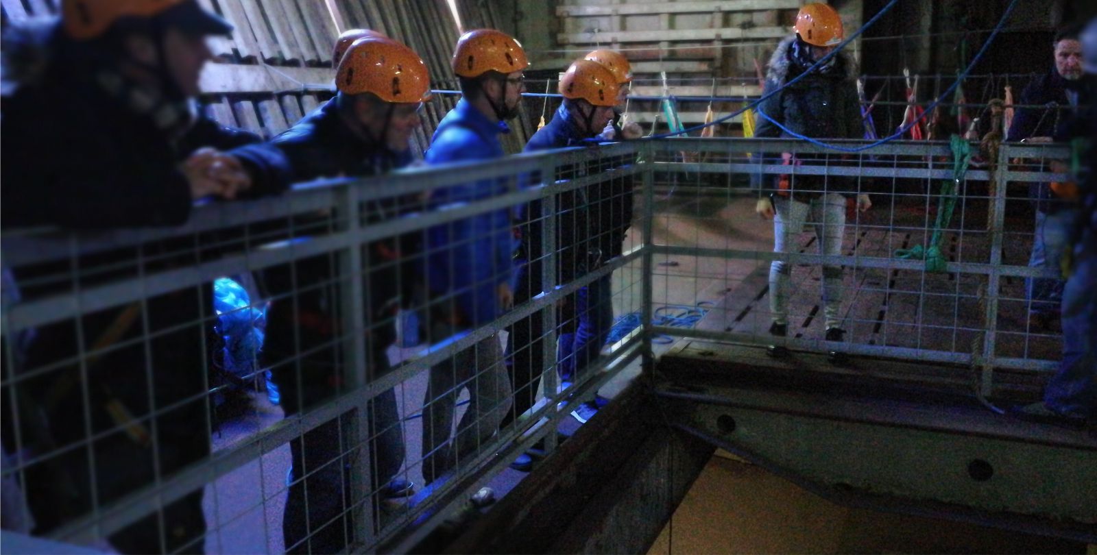Trübes Licht lässt die Kletterer die Tiefe der Ladeluken noch schwach erahnen.
